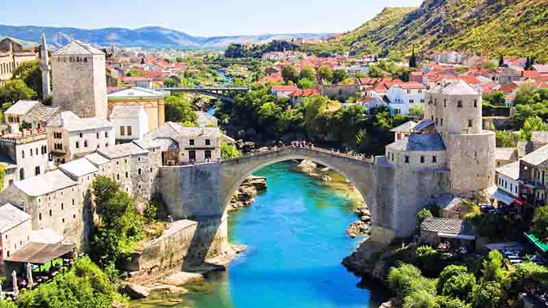 Mostar: a beautiful valley bedded between high mountains of Herzegovina, known for its famous bridge built by the Ottoman empire, a single span stone bridge crossing the Neretha river.